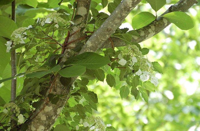 巨大なブナの木に絡みつくノリウツギは満開の時は見ごたえがあります(2019年6月20日)。