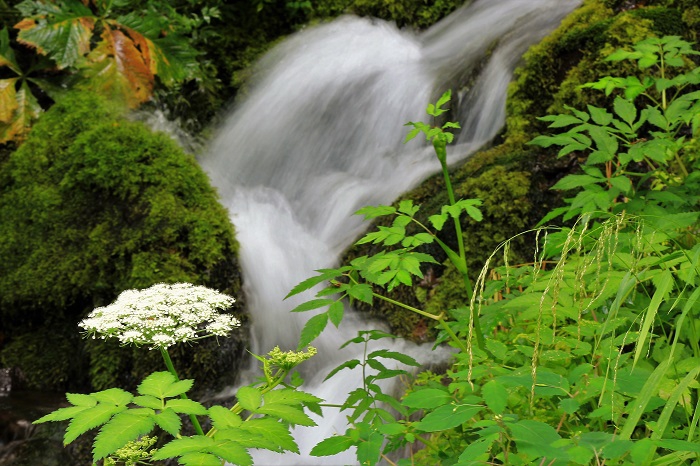 標高約900m以上に位置する深山の桧枝岐村は少し奥の沢や原生林内に入っていくだけで、驚くような清流の美しさや、最奥の秘境とも呼べるような奥深い沢や川の流れの自然景観、そして針葉樹林も含めた巨大な樹木の風景や、巨大な安山岩などの岩石の風景など、まさに深山霊峰という言葉そのものの景観に出会います。