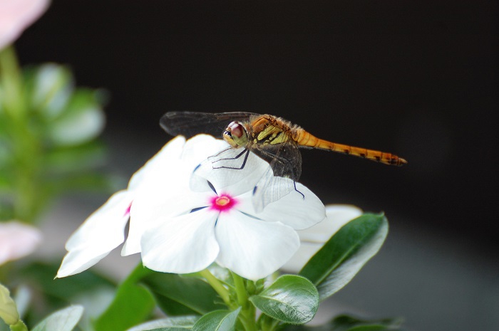 日日草の白い花々に止まるトンボの姿です(2023年7月10日)。